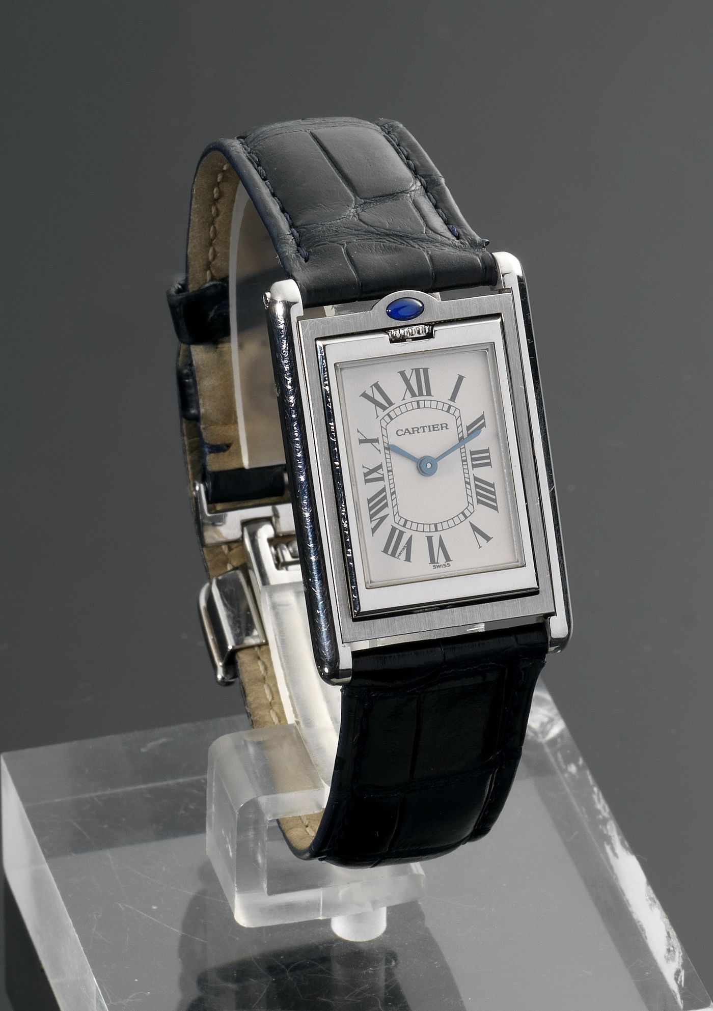 CARTIER Modello Tank basculante, misura media, in acciaio ref. 24653cd 34x24 Cassa in acciaio entro lunetta basculante satinata con zaffiro cabochon; quadrante con numeri romani serigrafati, minuteria a binario, lancette in acciaio azzurrato Movimento al quarzo