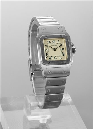 CARTIER Modello Santos Galbé, misura lady, anni '90 24x24 Cassa in acciaio di forma quadrata in tre parti con lunetta fermata da viti. Bracciale integrato Quadrante con numeri romani serigrafati minuteria a binario e lancette al gladio in acciaio azzurrato Movimento al quarzo