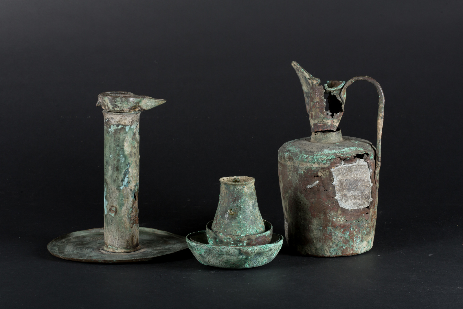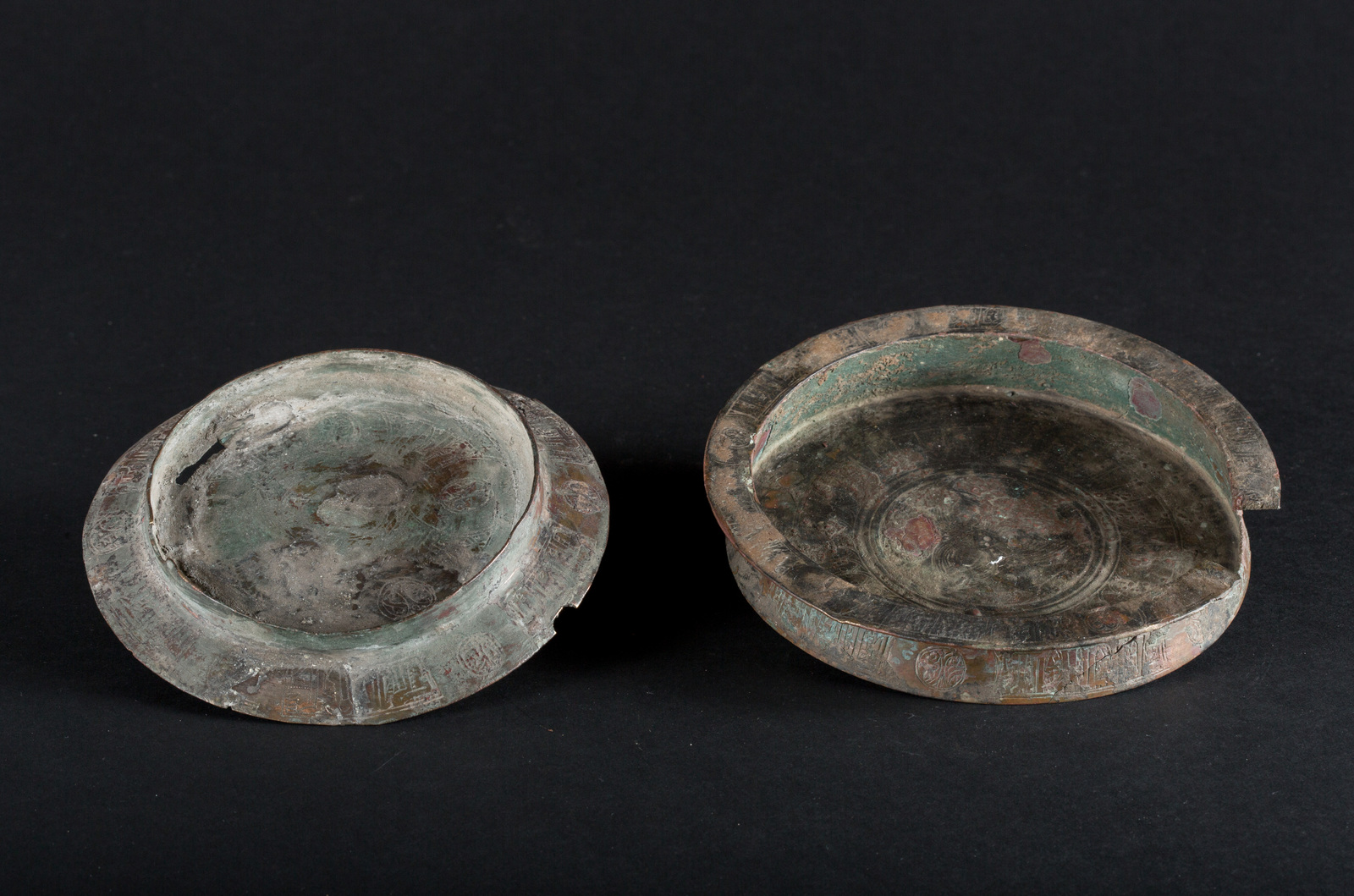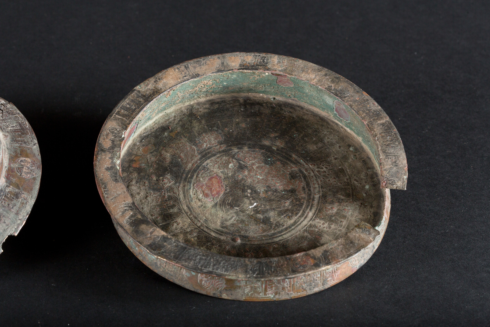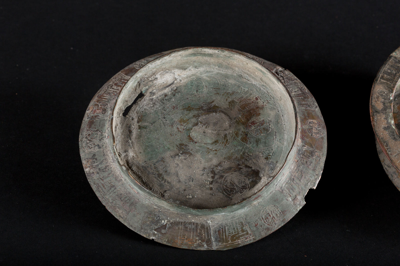 versatoio Herat (29 X 17 cm), piatto (diam. 25 cm) con lampada ad olio e piatto Ghaznavide con coperchio (diam. 18 X 3 cm). Tutti gli oggetti mostrano decorazione epigrafica entro cartigli e piccole rondelle incise a motivo floreale.