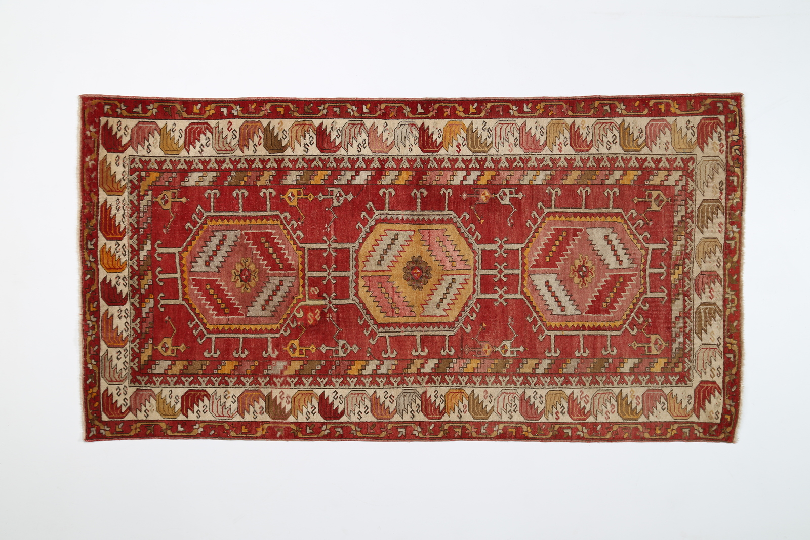 KONYA Tappeto orientale. Anatolia. 1950. Lana e cotone. Cm 114,00 x 216,00. Fondo mattone, 3 rombi. Ottimo stato di conservazione.