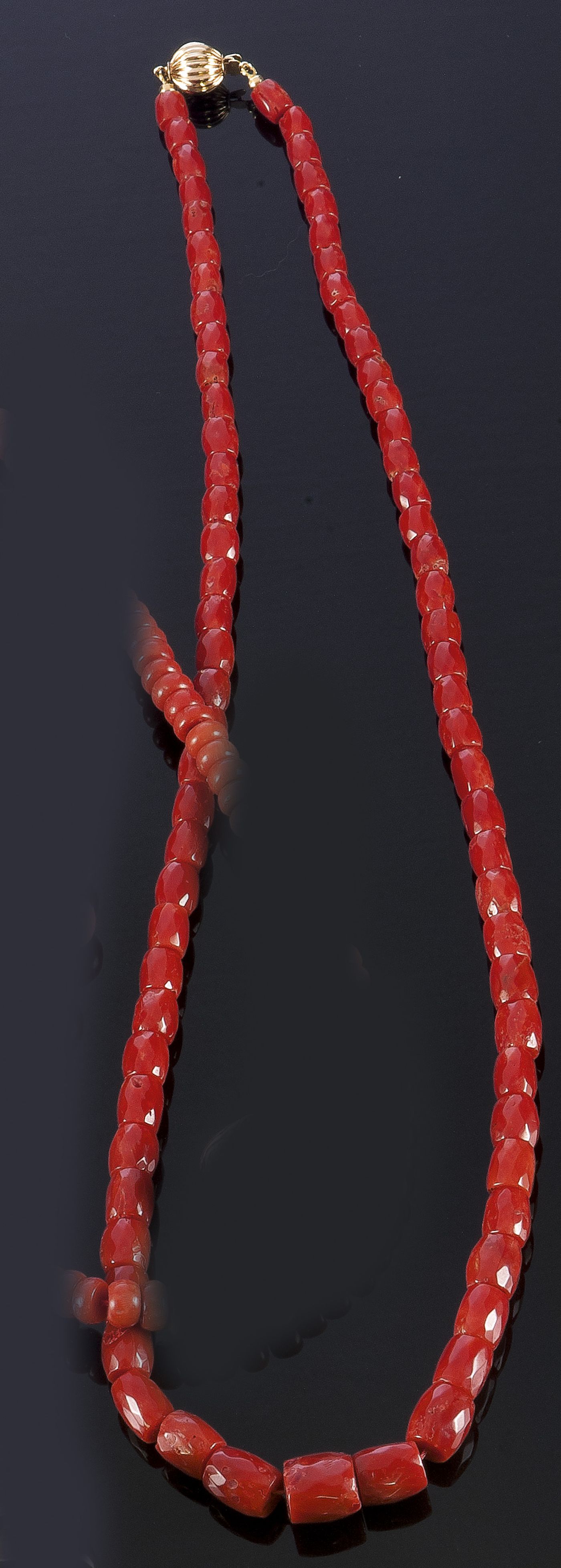 COLLANA DI CORALLO Collana composta da barilotti di corallo mediterraneo sfaccettato Chiusura in oro giallo 14 Kt Peso gr 61