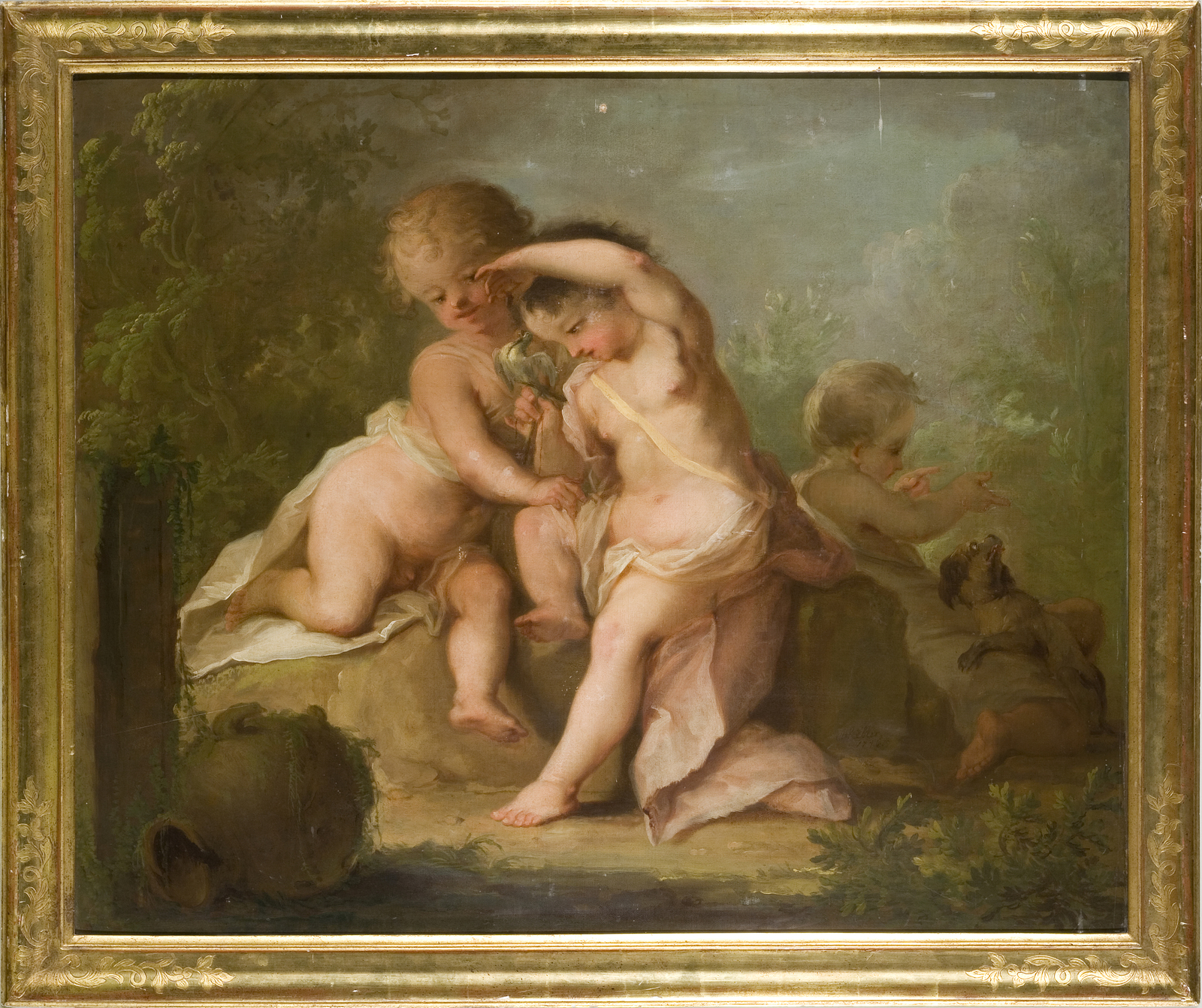 SCUOLA FRANCESE DEL XVIII SECOLO Gioco di putti. Olio su tela. Cm 105,00 x 86,50. . Cornice presente