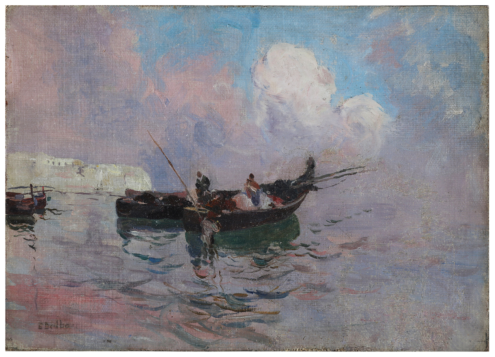 DALBONO EDUARDO (1841 - 1915) Marina con barca. Olio su tela applicato su cartone. Cm 25,00 x 16,00. Firma in basso a sinistra. Cornice presente