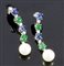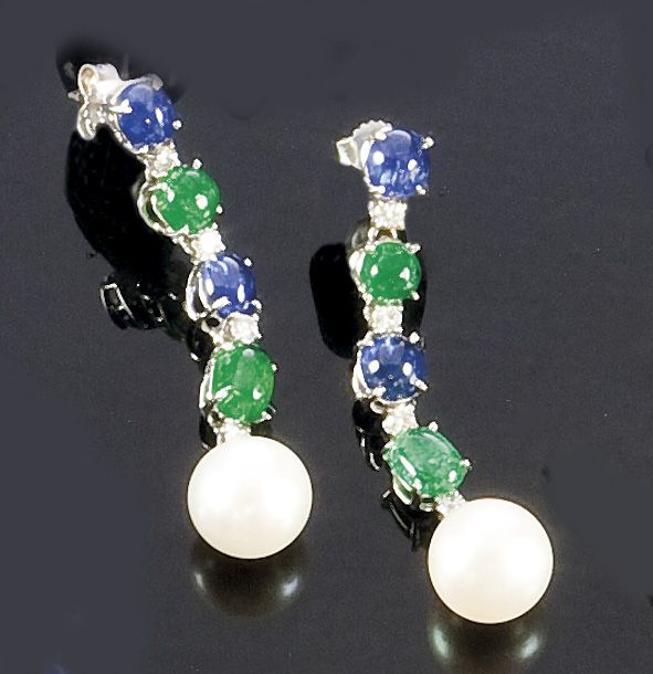 COPPIA DI ORECCHINI Coppia di orecchini pendenti in oro bianco con alternati zaffiri, smeraldi taglio cabochon, e diamanti taglio brillante rotondo per complessivi ct 0,50 ca; terminati con due perle australiane del diam di mm 10,6 Peso gr. 9,8