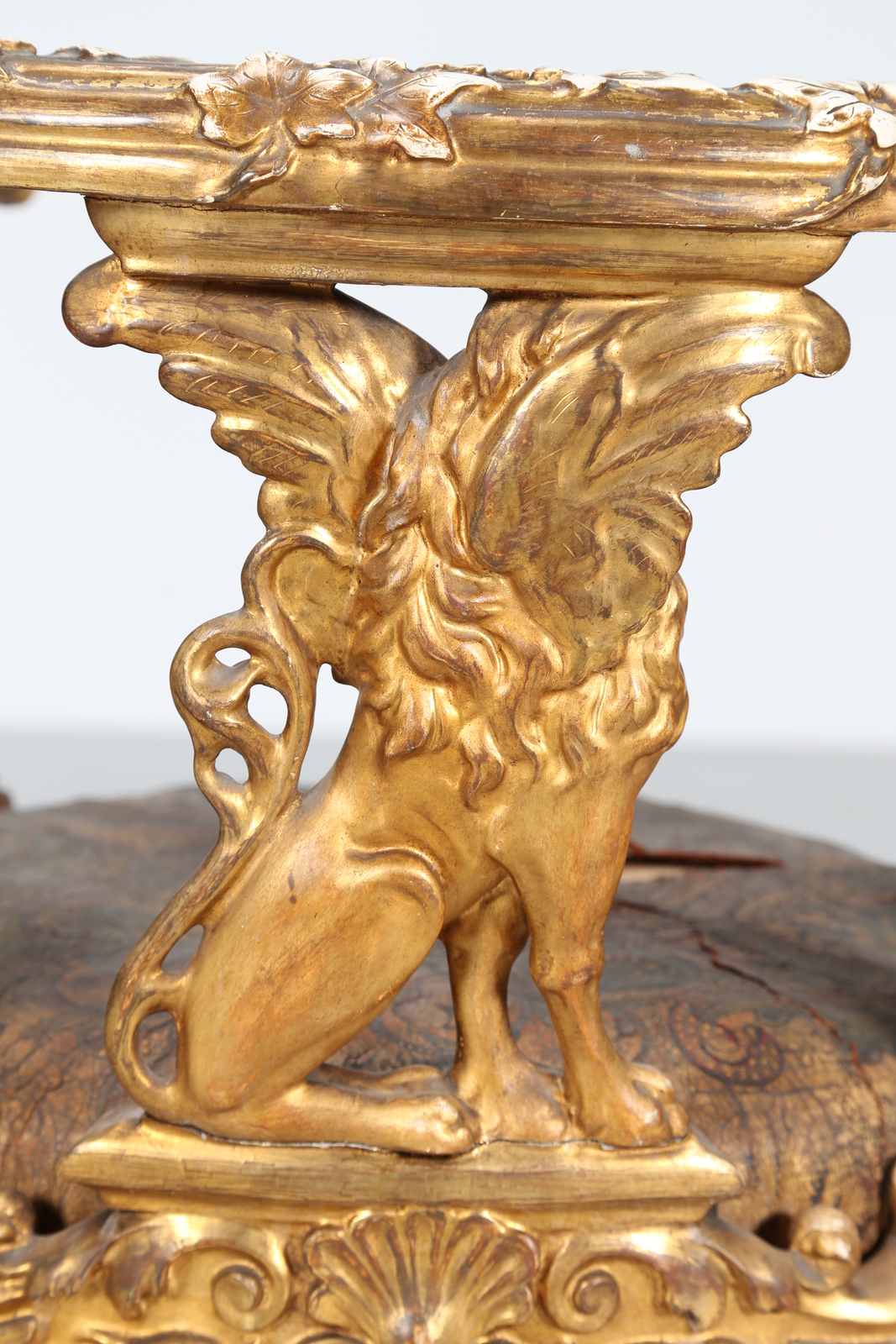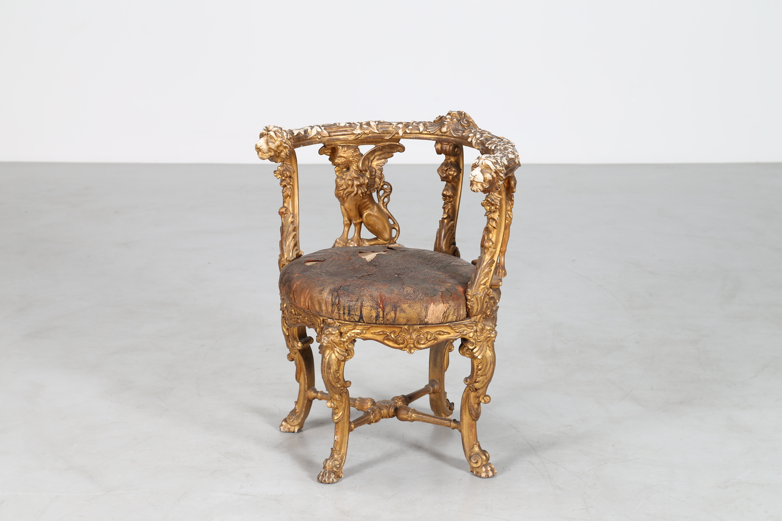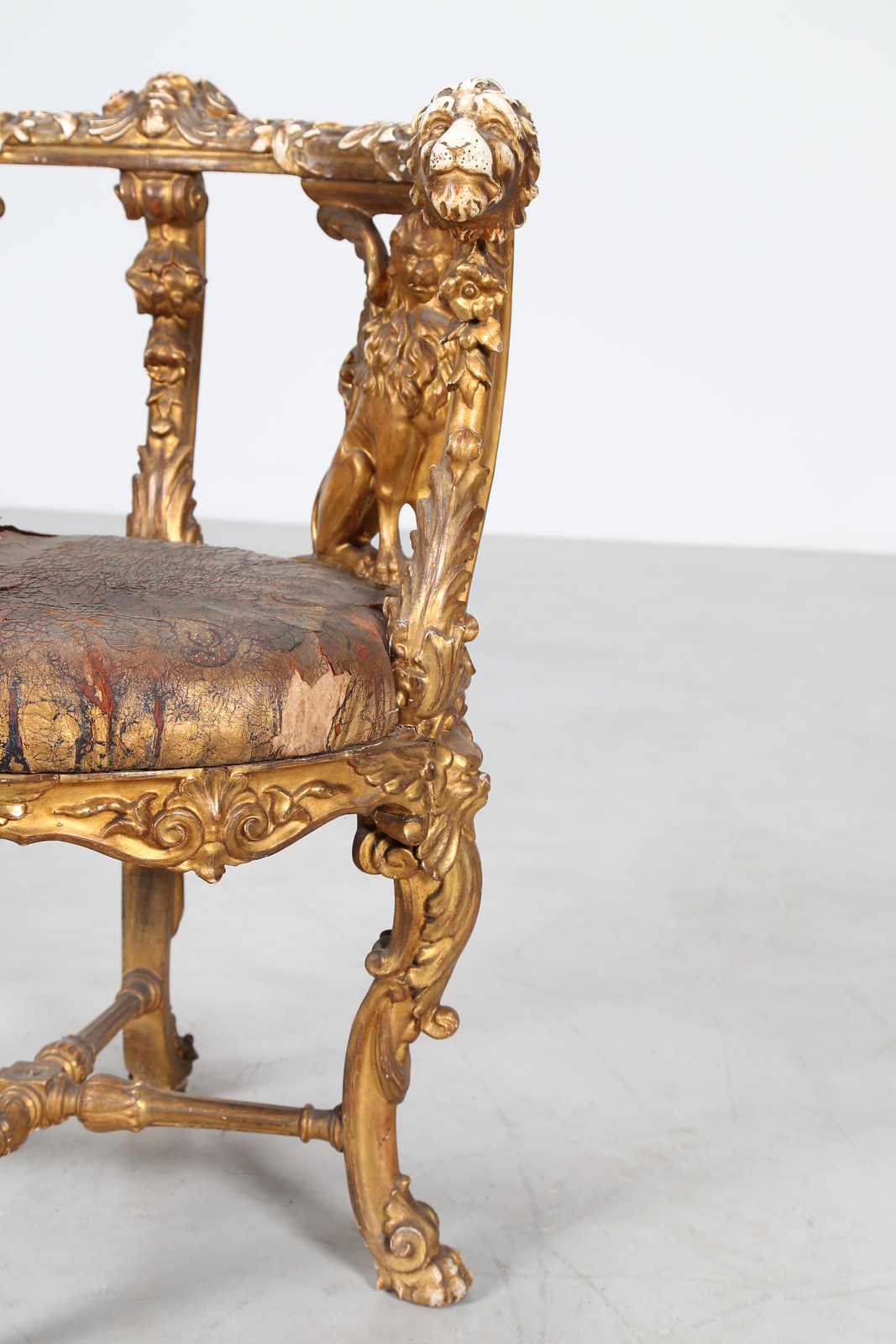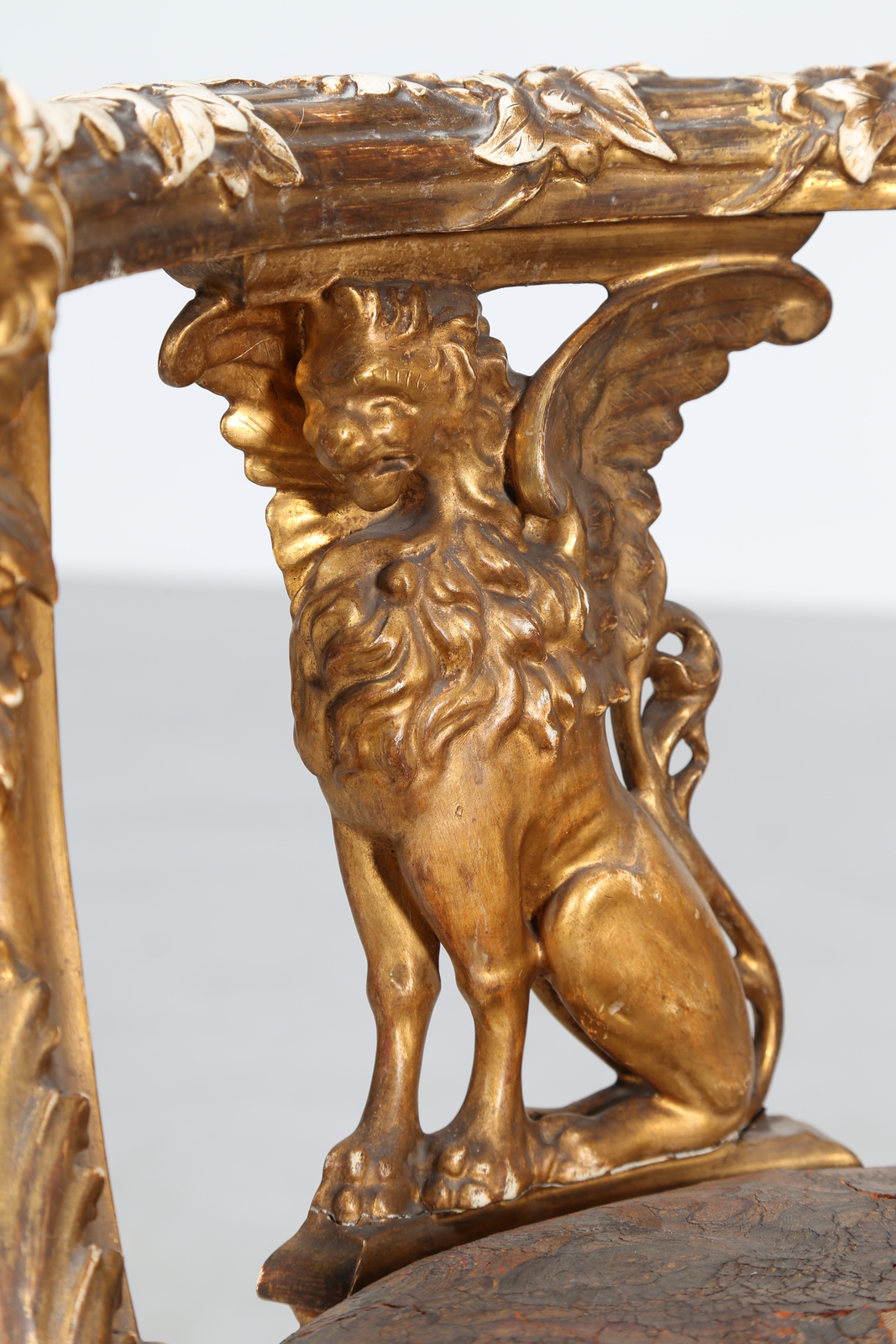 MANIFATTURA ITALIANA DEL XIX SECOLO Sgabello in stile rinascimentale in legno intagliato e dorato. . . Cm 68,00 x 79,00 x 60,00. Presenta difetti e rotture.