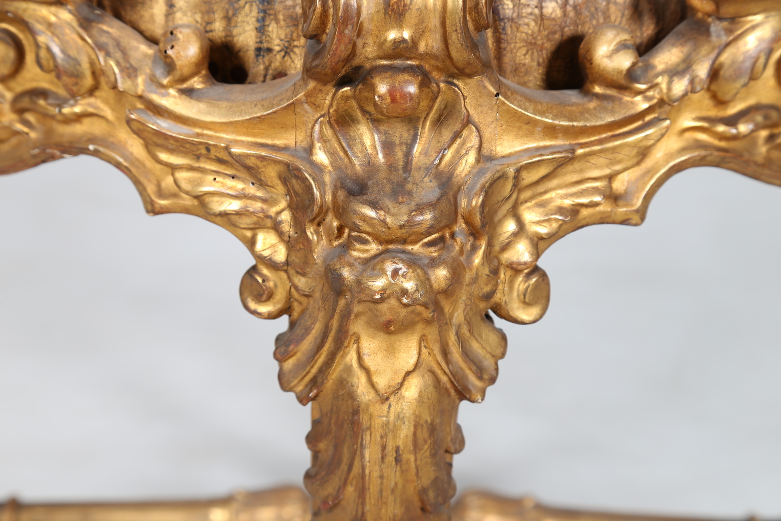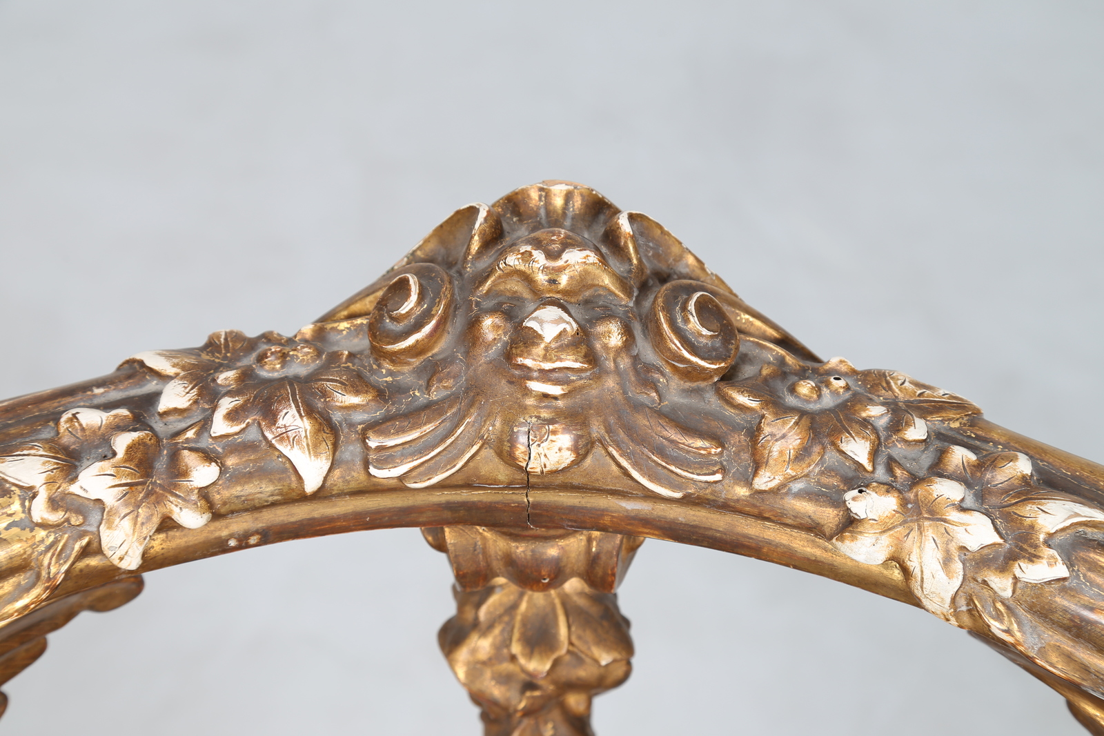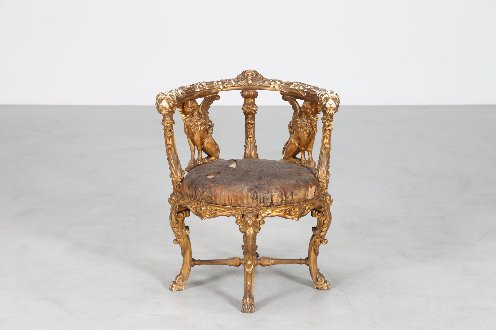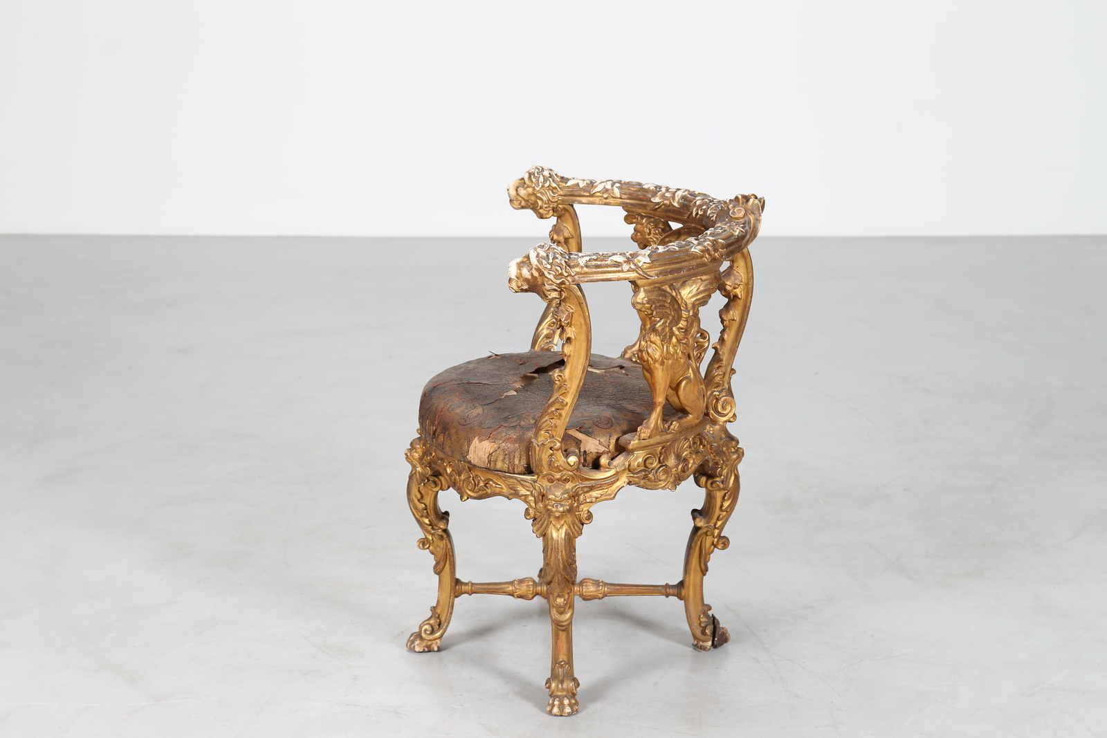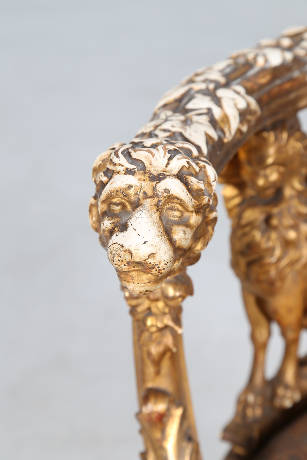 MANIFATTURA ITALIANA DEL XIX SECOLO Sgabello in stile rinascimentale in legno intagliato e dorato. . . Cm 68,00 x 79,00 x 60,00. Presenta difetti e rotture.