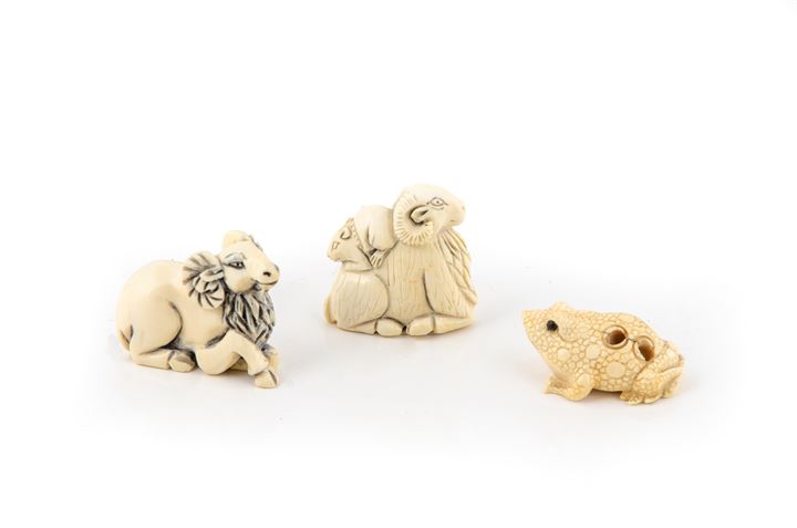 LOTTO DI TRE NETZUKE 3x2, 4x13,5x1,5 In avorio, raffiguranti una rana, due...
