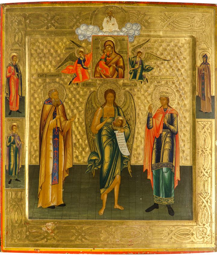 ICONA "Madonna con Bambino, San Giovanni Battista e Santi" Russia XIX secolo...