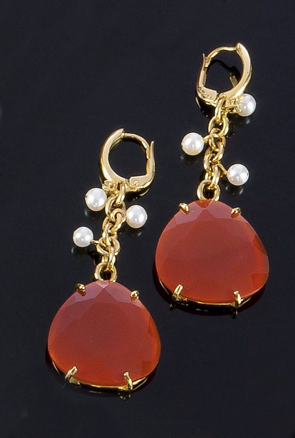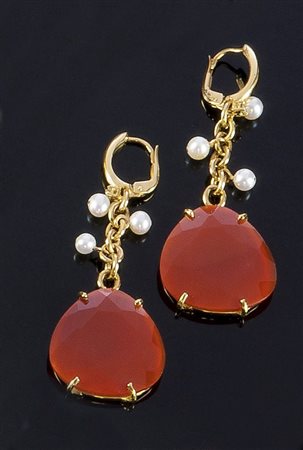 COPPIA DI ORECCHINI Coppia di orecchini in oro giallo composti da due grandi gocce di corniola, sfaccettate e piccole perline pendenti lungo il corpo Peso gr 13,1