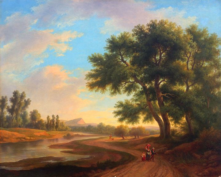 PITTORE NON IDENTIFICATO "Paesaggio con figure" 32,5x40,5 olio su tavola...