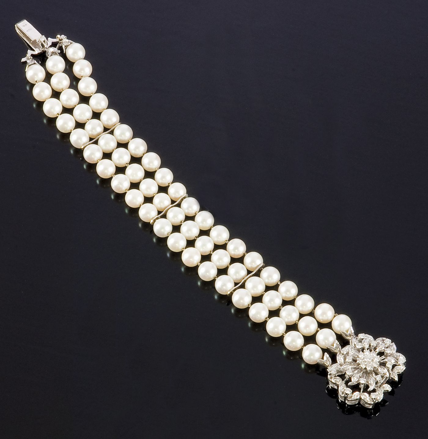 BRACCIALE Bracciale composto da tre fili di perle giapponesi, dal diam. di mm 6,5 a 6,9; distanziali e chiusura in oro bianco con diamanti taglio brillante rotondo e 8/8 per complessivi ct 0,85