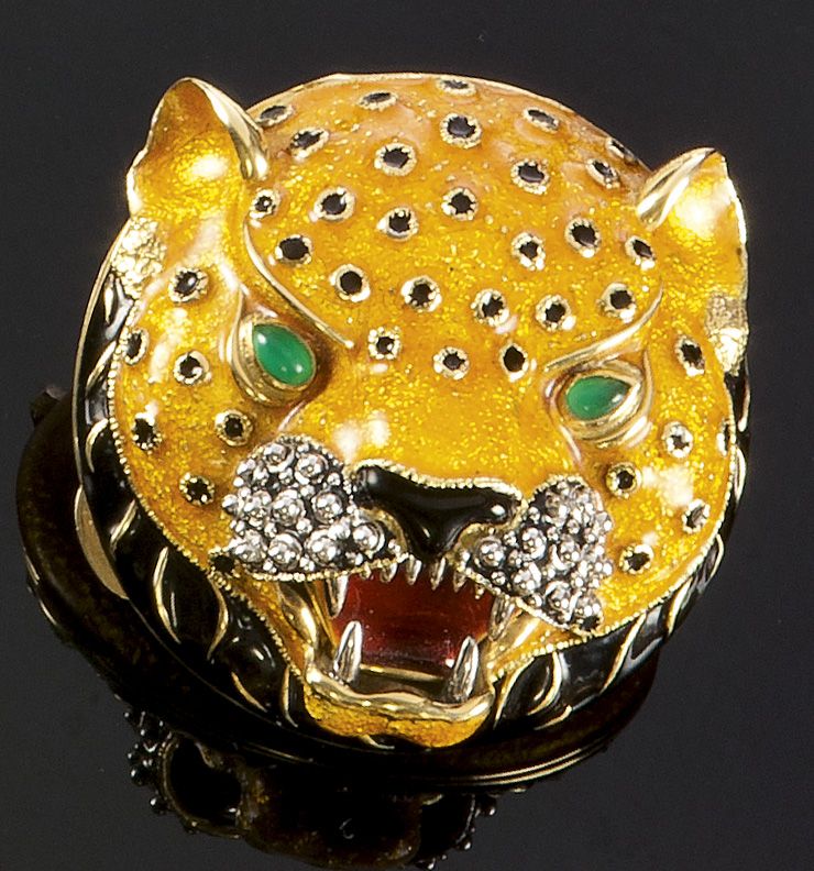 PORTACIPRIA Splendido portacipria in oro giallo, a forma di testa di tigre, con adate verdi e smalti policromi Peso lordo (incluso specchio) gr 118,9