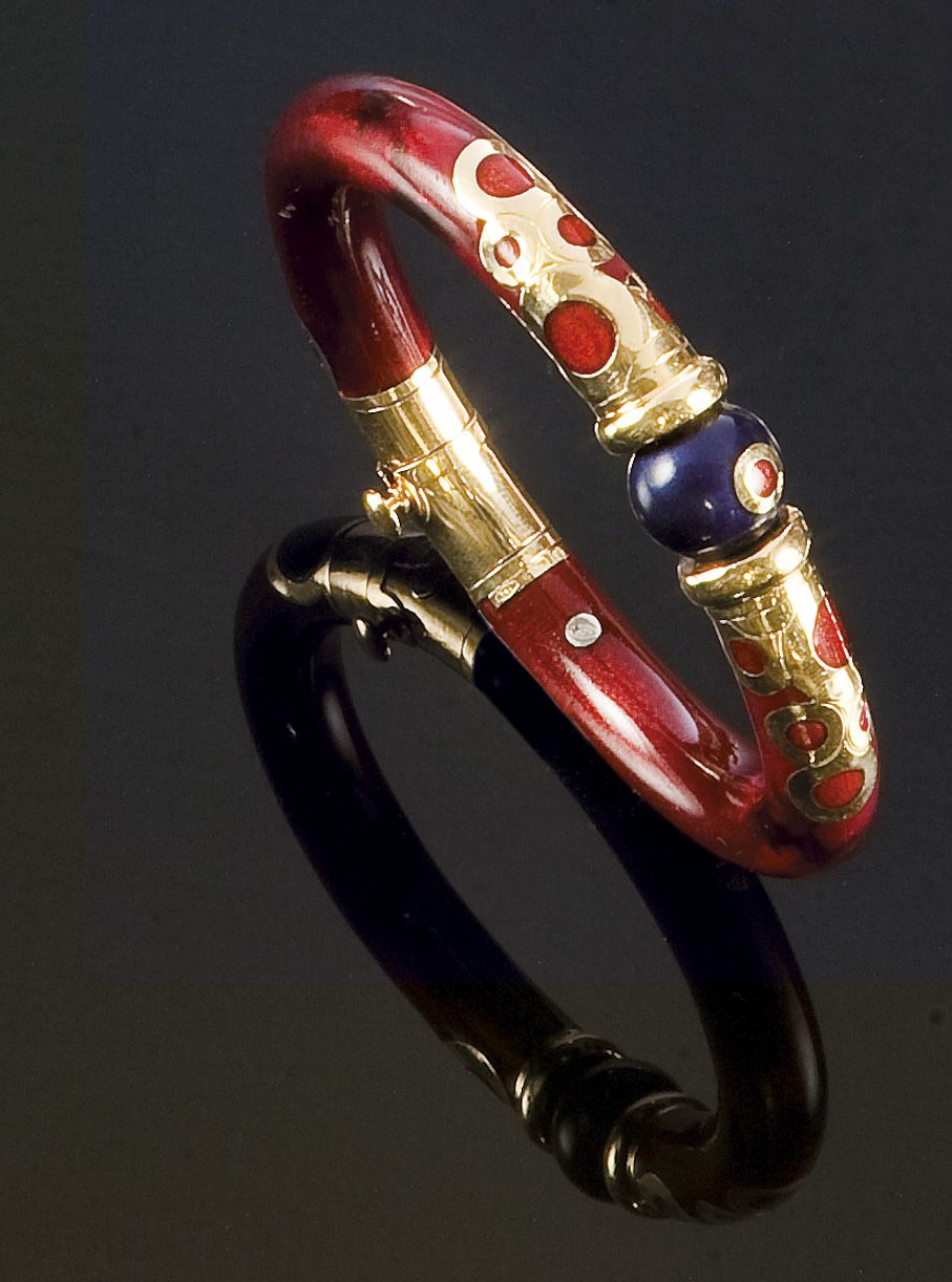NOUVELLE BAGUE Bracciale rigido, firmato "Nouvelle Bague" (N.L.B), in oro giallo, con smalti bordeaux e blu Peso gr 45