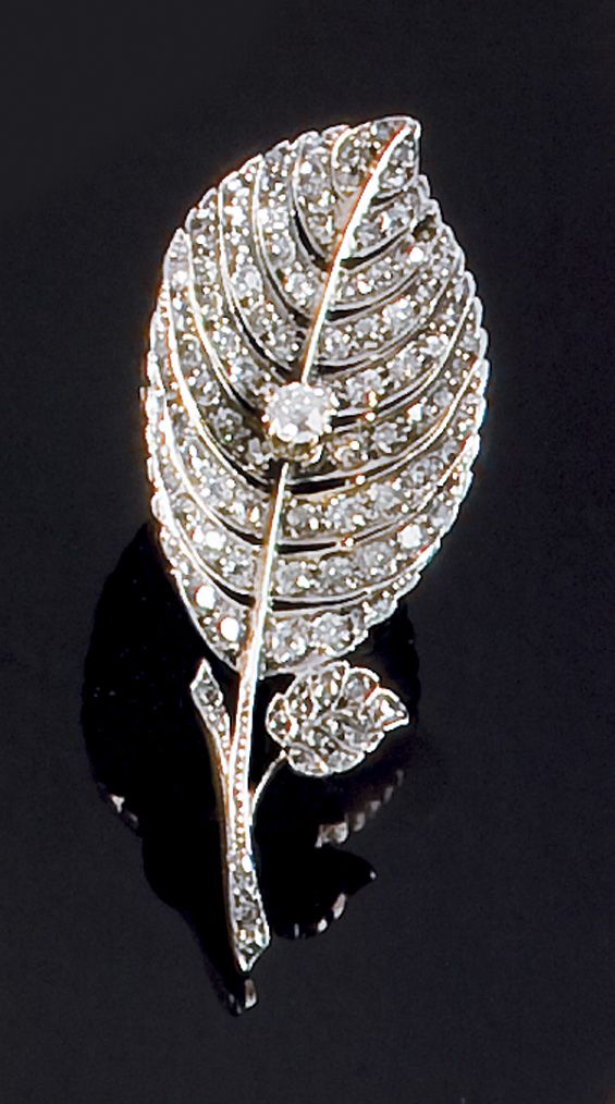Lotto 732 | SPILLA Spilla in oro giallo a forma di foglia, con diamanti taglio brillante...