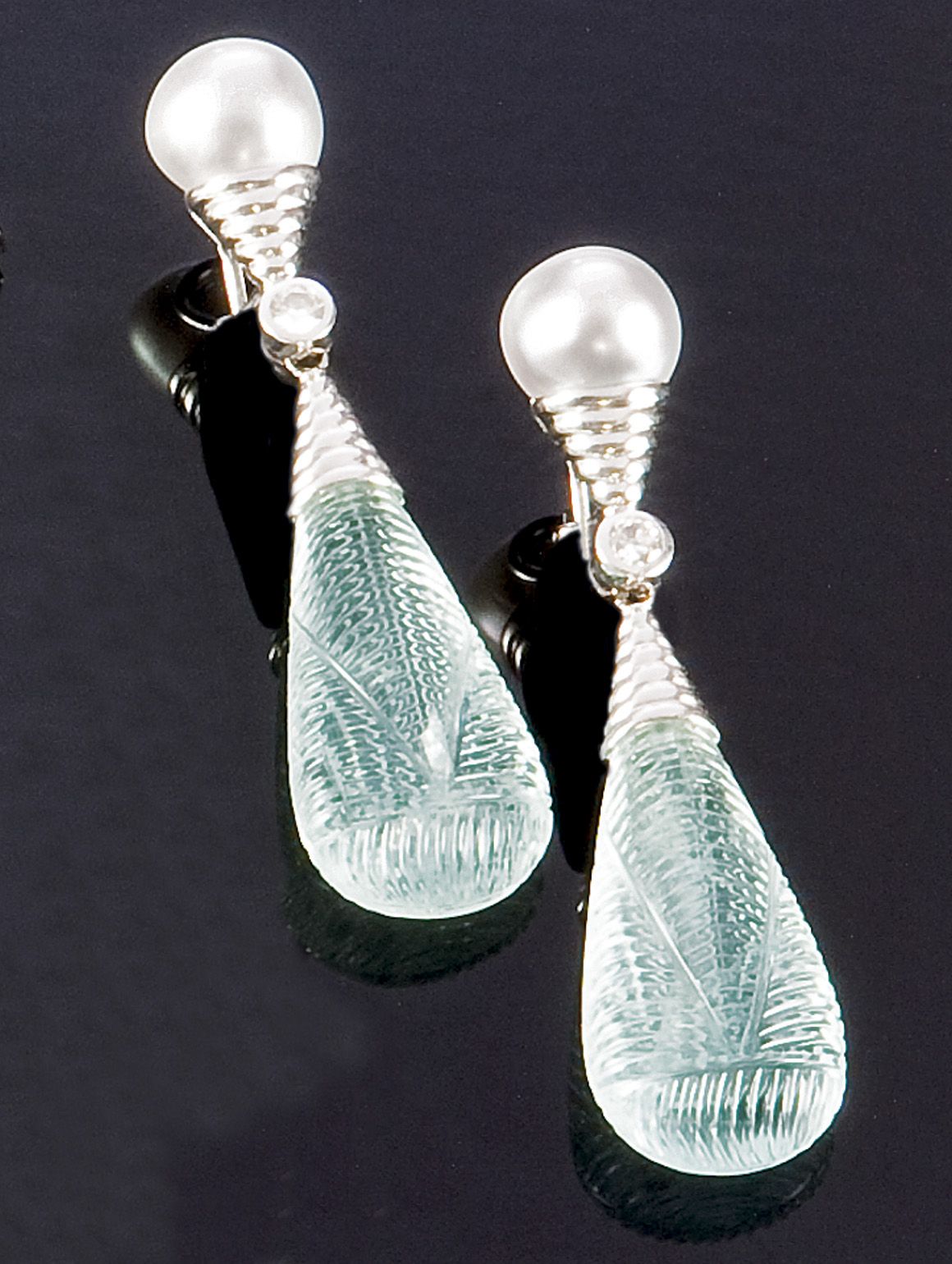 COPPIA DI ORECCHINI Coppia di orecchini in oro bianco con due gocce di acquamarina incise pendenti; due perle australiane dal diam. di 12mm e due diamanti taglio brillante rotondo per complessivi ct 0,50 ca Peso gr 37,00
