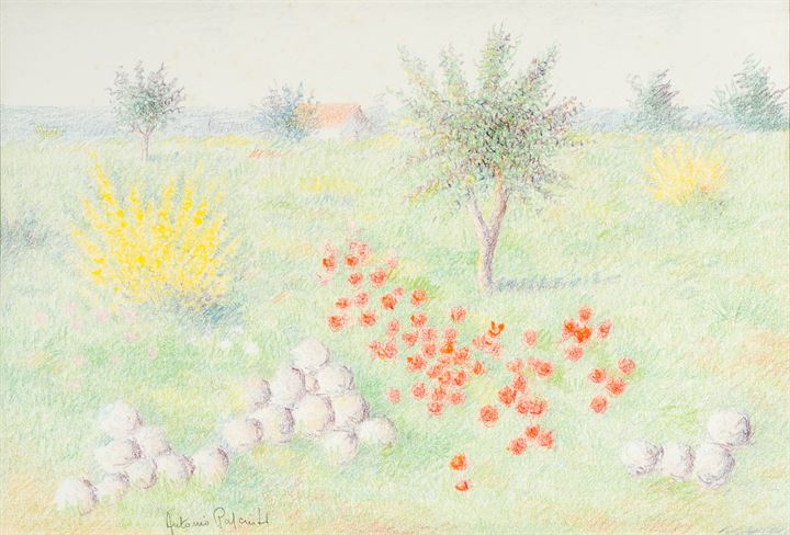 PASCIUTI ANTONIO Lacedonia (AV) 1937 "Paesaggio fiorito" 42x62 pastelli su...