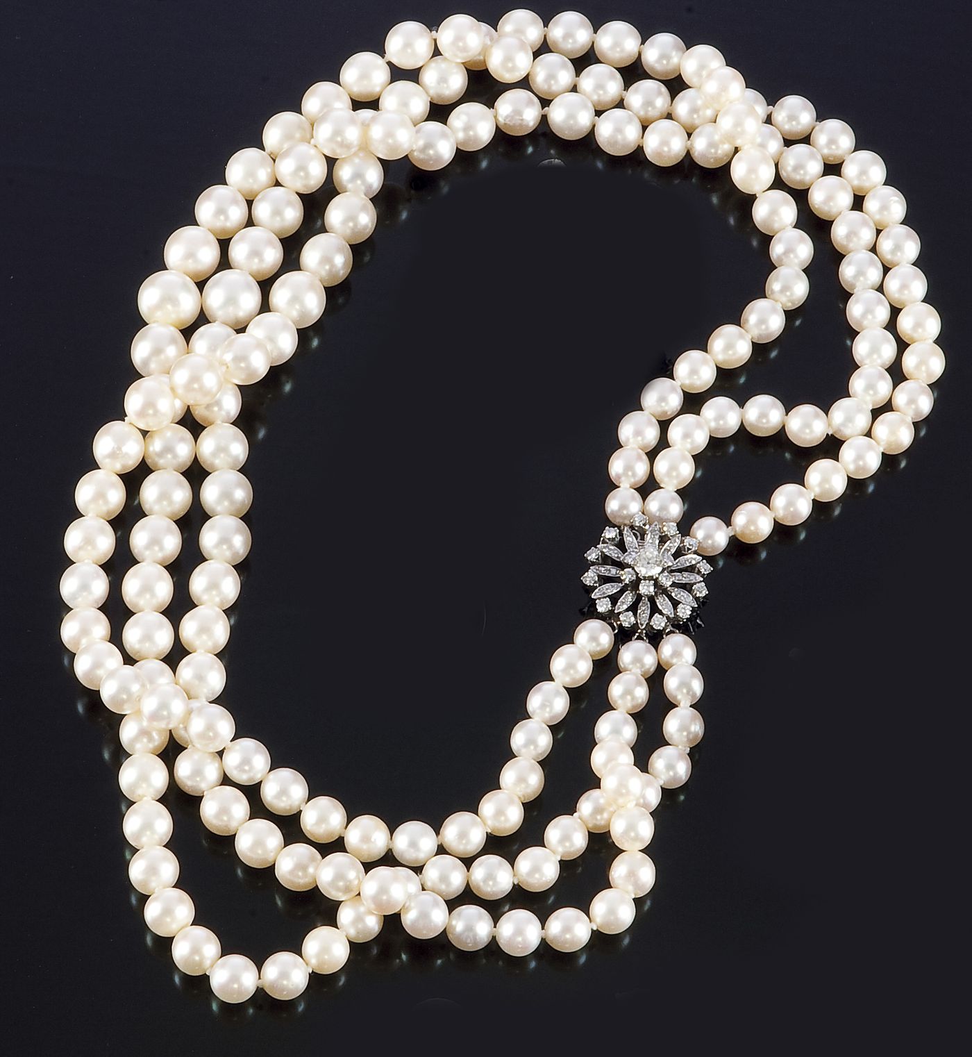 COLLANA DI PERLE Collana composta da tre fili di perle a scalare da mm 6,7 a 10,8 Fermaglio in oro bianco con diamante taglio brillante rotondo di vecchio taglio di ct 0,45 ca ed ai lati diamanti taglio brillante rotondo e 8/8 per complessivi ct 1,05 ca