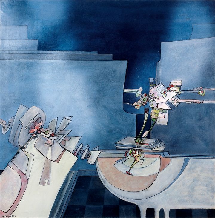 CANUTI NADO 1929- "Interno con avvenimento" 1974 100x100 olio su tela Opera...