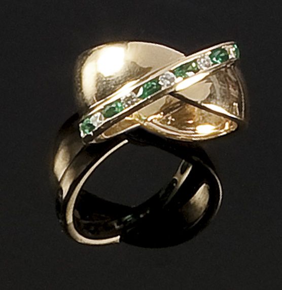 ALFIERI & ST. JOHN Anello, firmato " Alfieri & St. John", composto da due fasce in oro giallo, una liscia ed una con sette diamantini taglio brillante rotondo alternati a piccoli smeraldi taglio ovale diamantini taglio brillante rotondo per complessivi ct 0,85 ca Peso gr 10,2 Misura 15