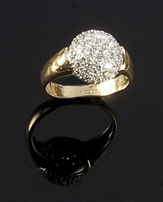 ROCCA Anello in oro giallo, firmato "Rocca", sommità in oro bianco, con pavè di diamanti taglio brillante rotondo per complessivi ct 1,20 ca Peso gr 6 Misura 19