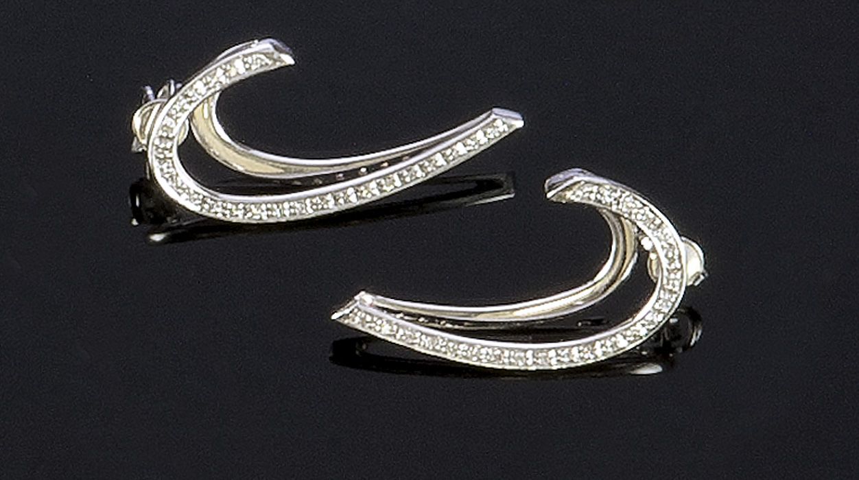 VISCONTI Coppia di orecchini in oro bianco, firmati "Visconti", lavorati a volute con diamanti di taglio brillante rotondo per complessivi ct 0,22 ca Peso gr 6,7