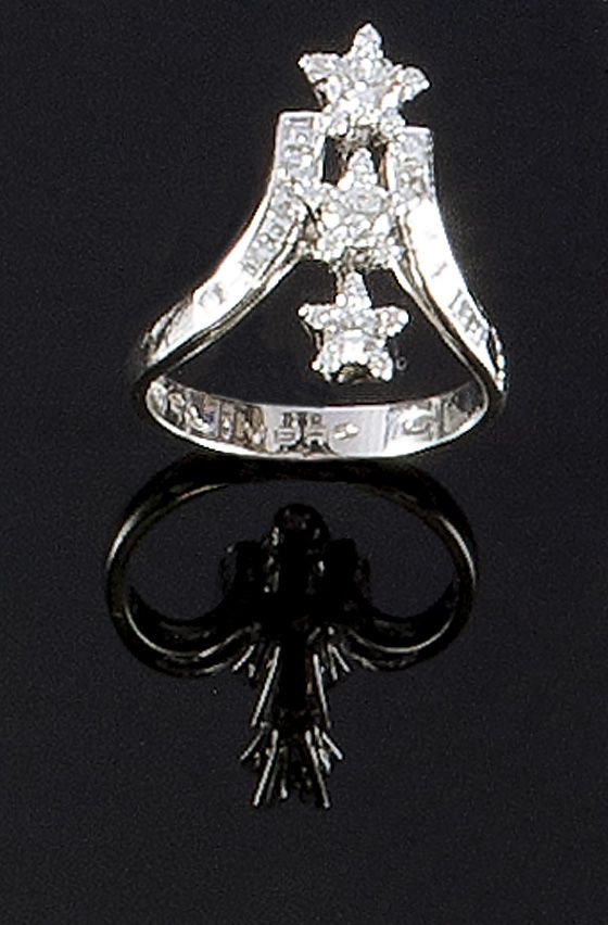 OLIVERO Anello in oro bianco, firmato "Olivero", composto da due anse trattenenti tre fiori stilizzati, interamente in diamanti taglio brillante rotondo, 8/8 e carrè, per complessivi ct 0,90 ca Peso gr 5,00 Misura14