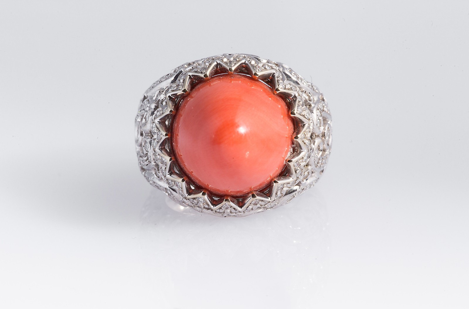 Anello in oro bianco traforato con diamanti cts 1.25 circa e corallo. . ....