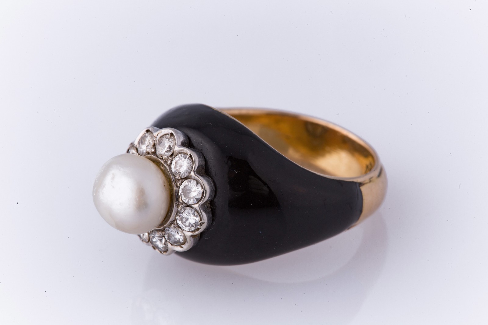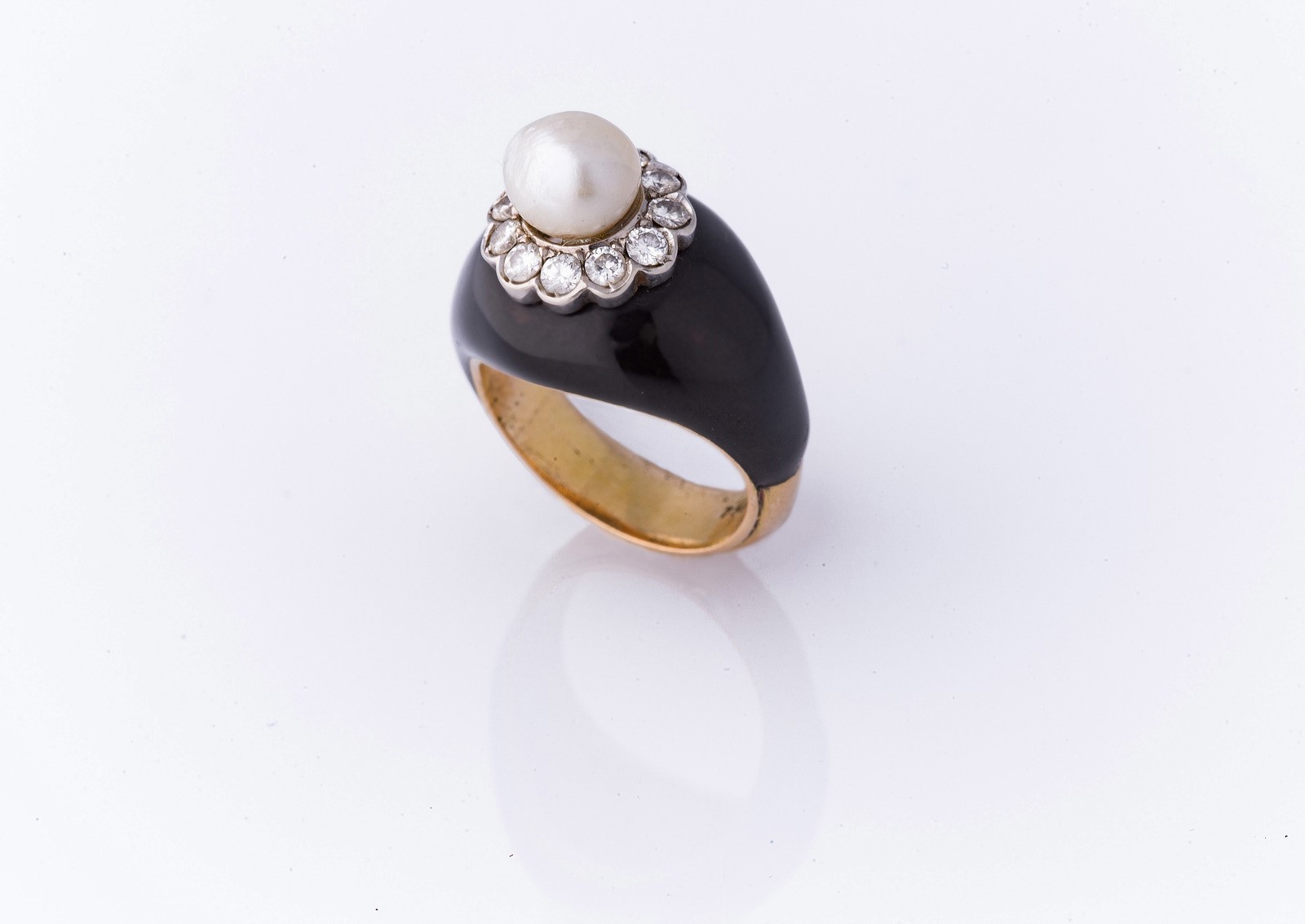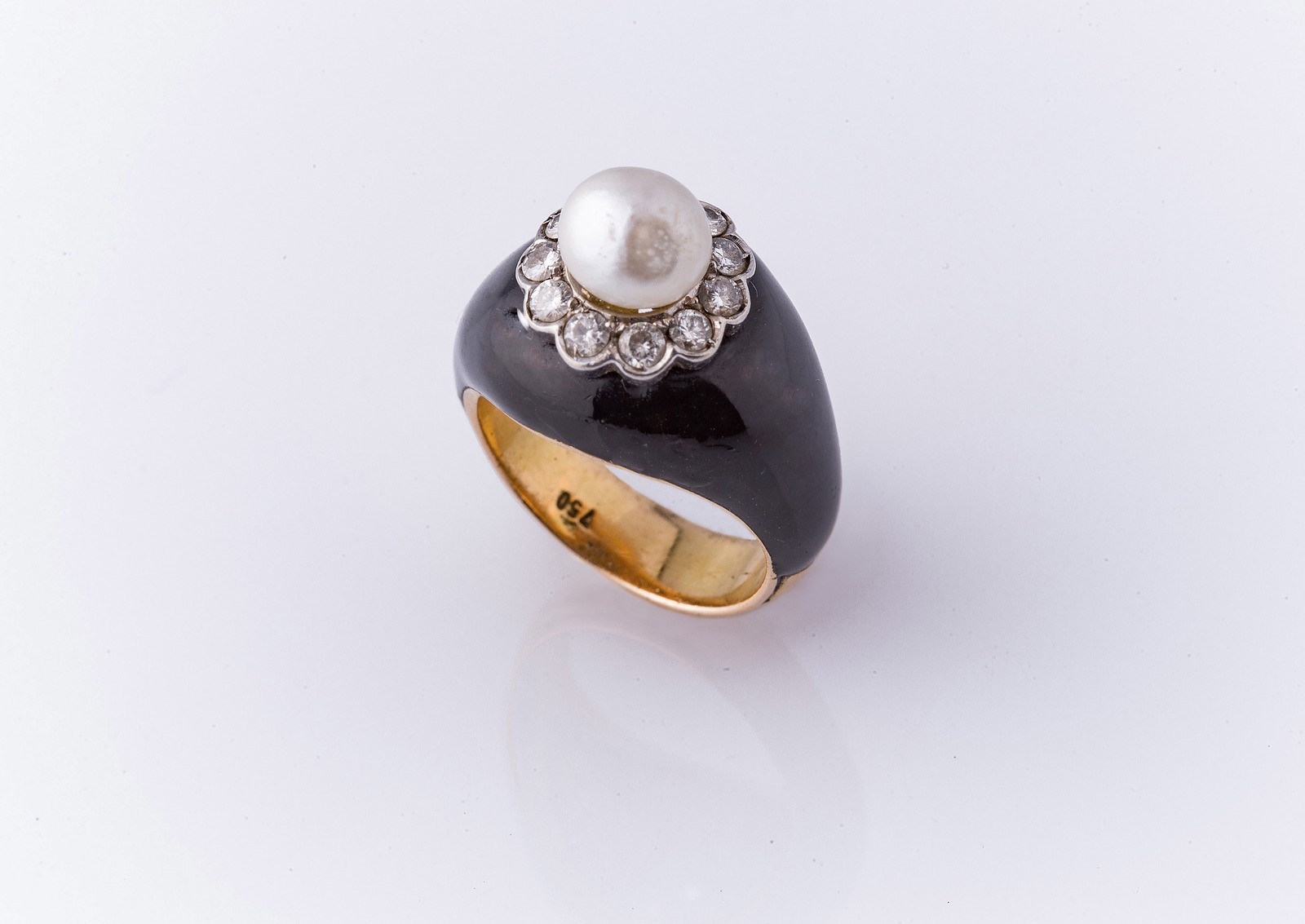 Anello in oro smaltato gr 13.9, diamanti cts 0.45 circa e perla naturale. . .