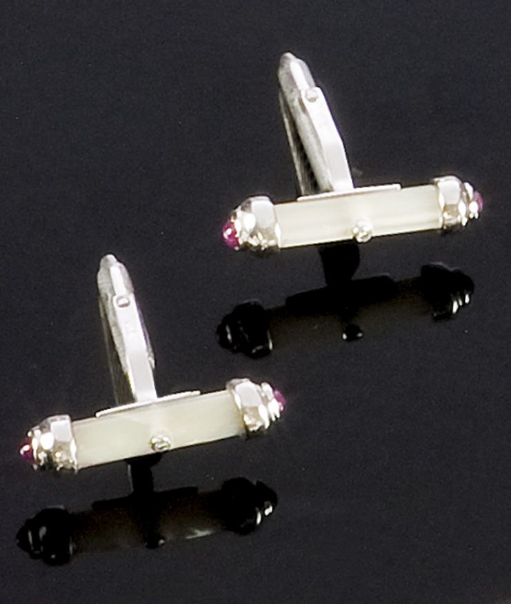 GEMELLI Coppia di gemelli in oro bianco, con barretta in madreperla e due piccoli diamanti taglio brillante rotondo inseriti al centro. Quattro rubini taglio cabochon disposti alle estremità della barretta Peso gr. 6,4