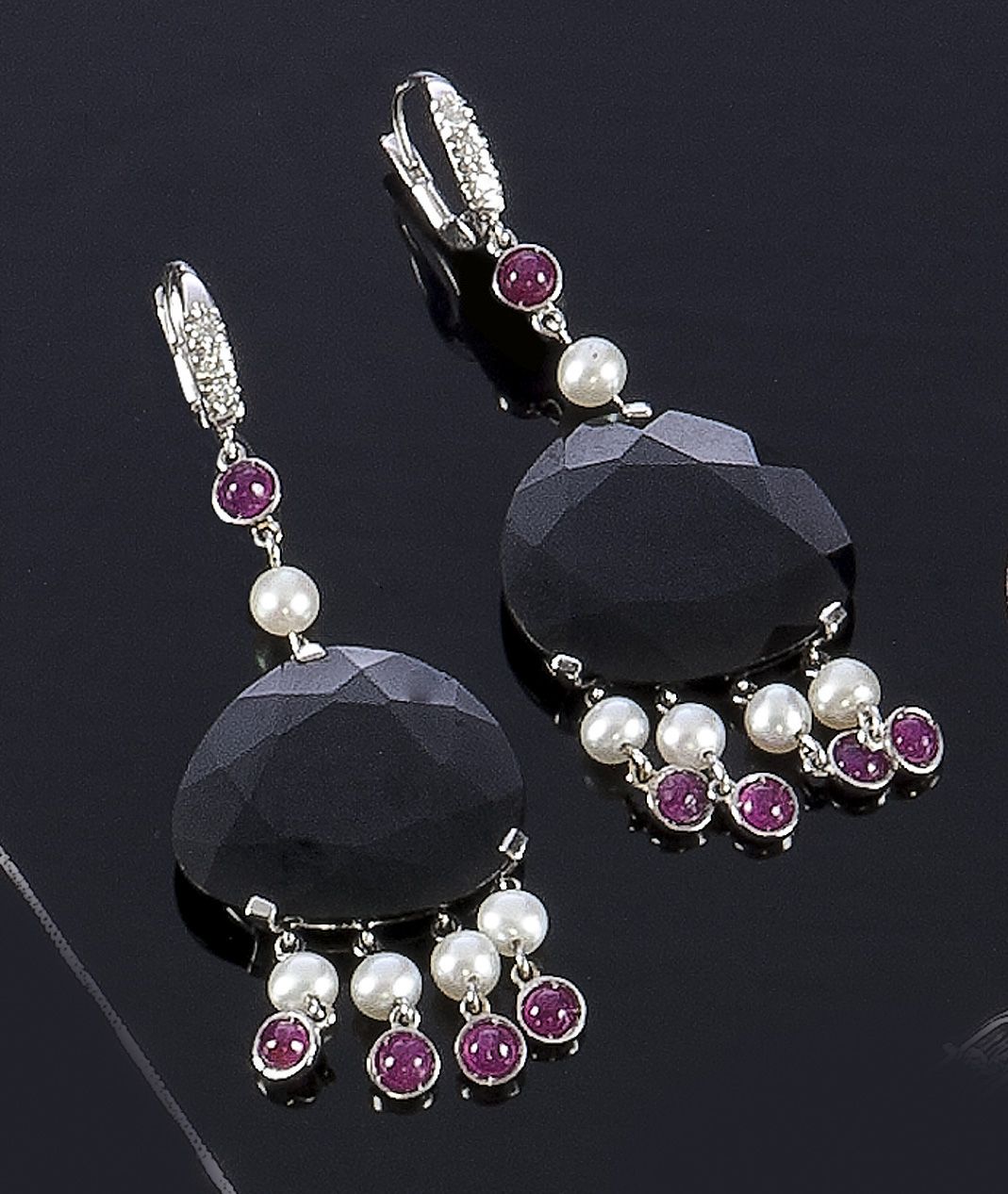 COPPIA DI ORECCHINI Coppia di orecchini in oro bianco composti da due gocce di onice, sfaccettate, terminati con otto piccole perle e otto rubini taglio cabochon Due perline e due rubini taglio cabochon lungo il corpo; piccoli diamanti taglio brillante Peso gr 15,3