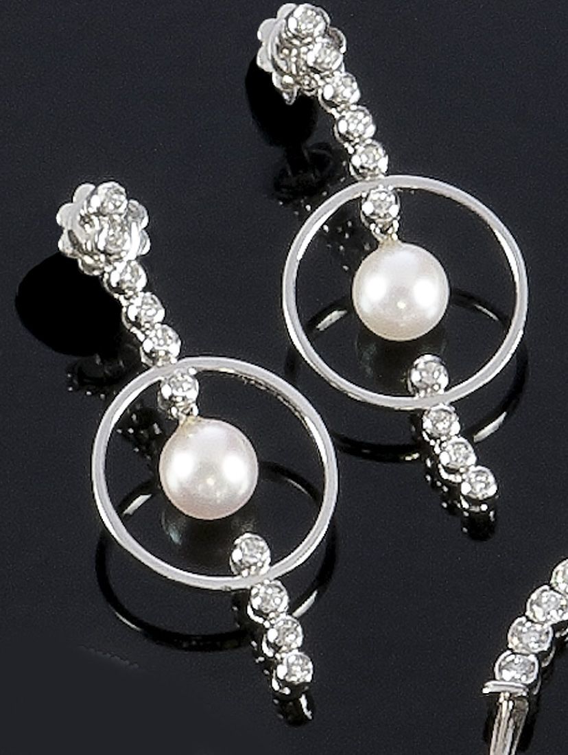 Coppia di orecchini in oro bianco, pendenti, con due perle inserite all'interno di un cerchio