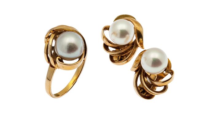 in oro giallo composta da coppia di orecchini ed anello con perle giapponesi del diam di mm 7,0 ca