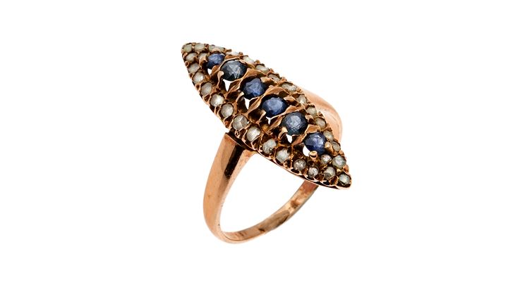in oro rosa, sommità a losanga, con rosette di diamanti per totali ct 0,30 ca e zaffiri taglio rotondo per totali ct 0,60 ca