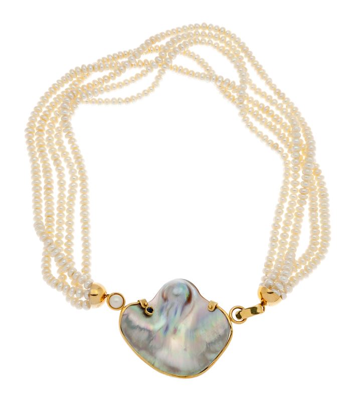 composto da cinque fili di perline di acqua dolce del diam di mm 5,0 e 5,5 ca; al centro chiusura con grande madreperla ed uno zaffiro a decoro