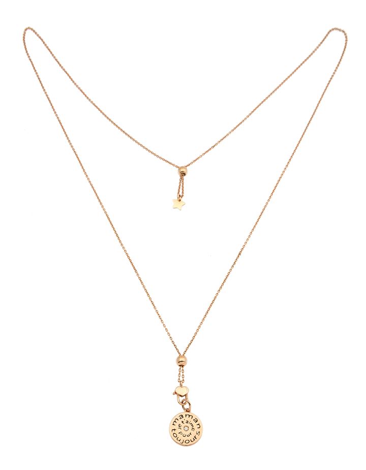 in oro rosa a bassa caratura, di forma rotonda con incisa la scritta "maman je t'aime pour toujour" ed al centro un piccolo diamante taglio brillante
