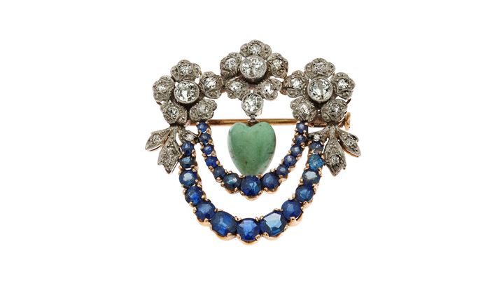 in oro bianco e giallo con turchese centrale basculante a forma di cuore, zaffiri taglio brillante per totali ct 2,0 ca e diamanti taglio brillante di vecchio taglio per totali ct 0,80 ca