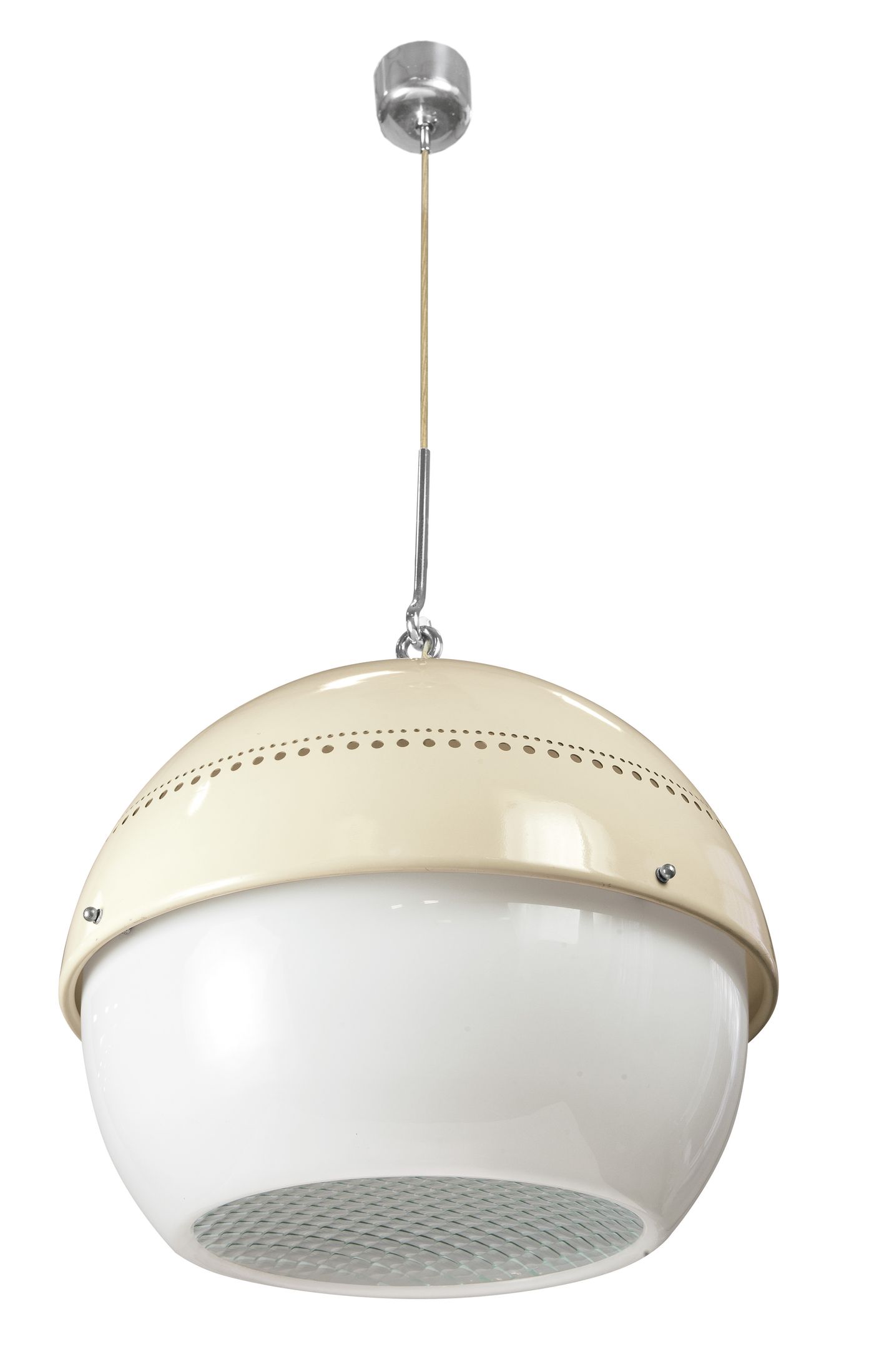 ASTI SERGIO - Lampada a sospensione mod. 2048 px. Alluminio laccato, vetro stampato concavo, gancio in metallo cromato. Prod. Arteluce 1966. Etichetta del produttore. Diam. cm 49. Bibl.: Fotocopia della pagina del catalogo Arteluce 1966 disponibile.