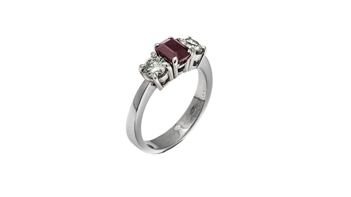 in oro bianco, modello trilogy, con due diamanti taglio brillante per totali ct 0,63 ca ed al centro rubino taglio rettangolare di ct 1,02 ca