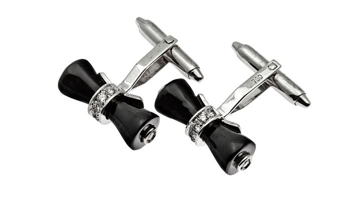 COPPIA DI GEMELLI Peso gr 6,1 in oro bianco con fiocchi in onice e diamanti...