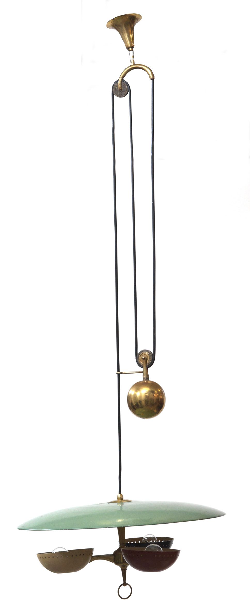 LAMPADA Lampadario a saliscendi. Diffusori a luce indiretta in alluminio laccato a colori differenti, grande parabola in alluminio internamente laccato bianco, contrappeso e particolari in ottone zapponato. h cm 53