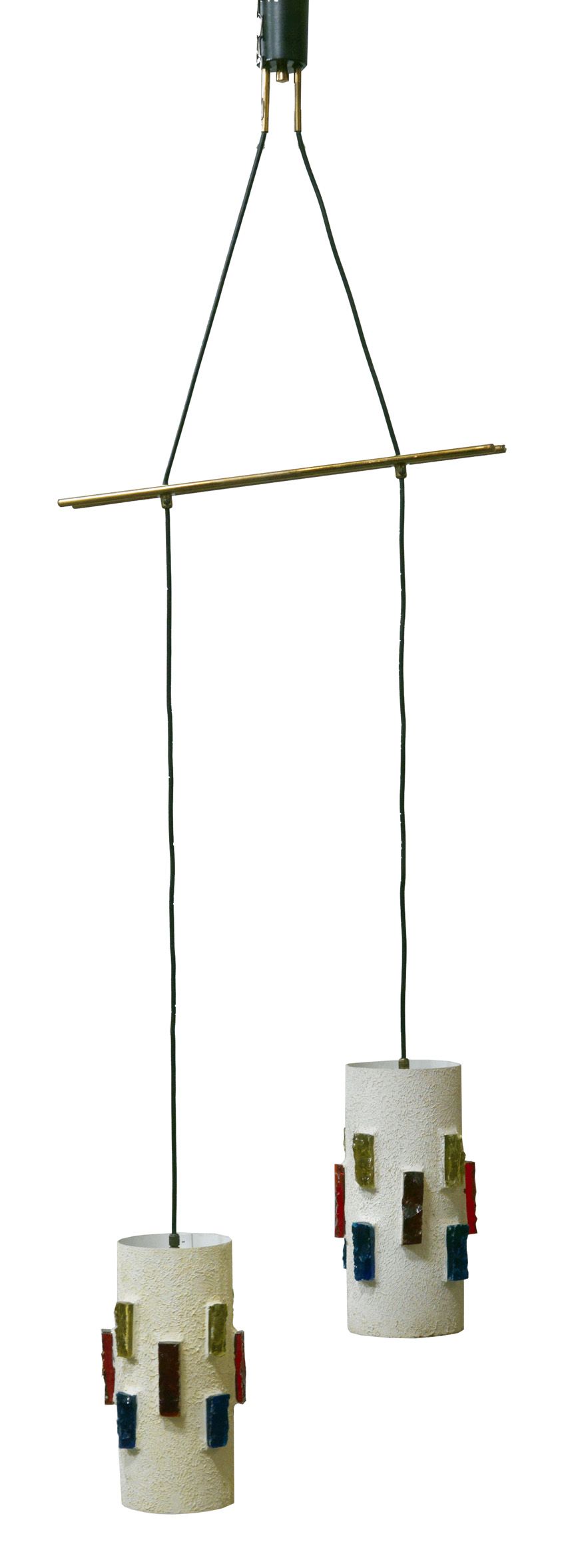 LAMPADARIO Lampadario con diffusori in metallo laccato bianco con applicazioni in cristallo colorato a spacco. Tige in ottone zaponato. 1955 circa. h cm 161,5