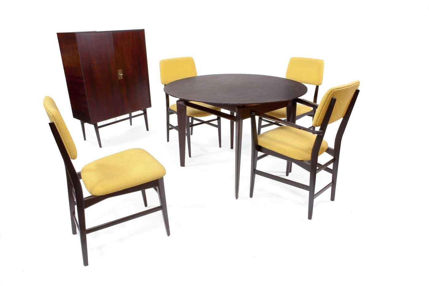 UFFICIO TECNICO DASSI Sala da pranzo composta da tavolo, tre sedie, una poltroncina, un mobile contenitore a due ante. Prod. Dassi 1955 circa . tavolo cm 75,5x114 credenza cm 119x80x40 sedie cm 92x40x53 Bibl.: Rivista dell’ arredamento, n° 51, marzo 1959, inserzione pubblicitaria, per il tavolo, Aprile 1959, per il mobile contenitore (variante con cassetti e ribaltina)