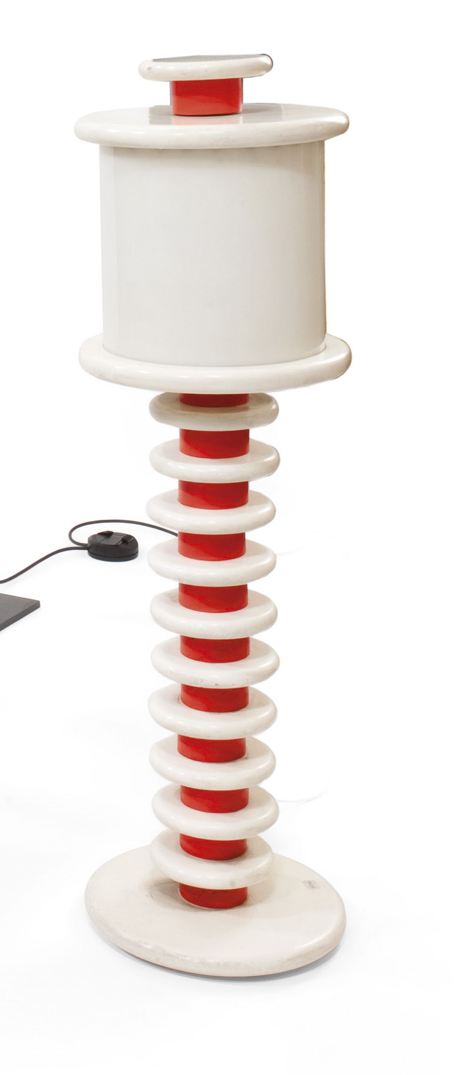 LAMPADA Lampada a totem composta da elementi in legno tornito e laccato. Diffusore in plexiglass opalino. Nello stile di Ettore Sottsass. h cm 100