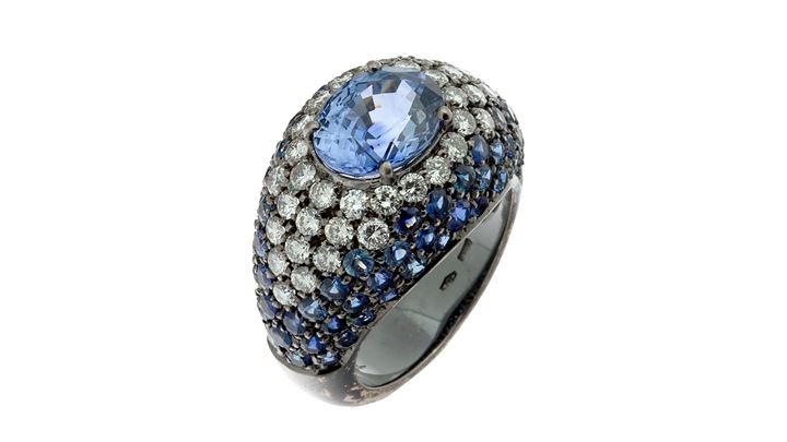 in oro brunito, sommità bombata, con al centro zaffiro Cylon taglio ovale di ct 3,50 ca, circondato da diamanti taglio brillante per totali ct 1,40 ca e zaffiri taglio brillante per totale ct 4,0 ca