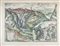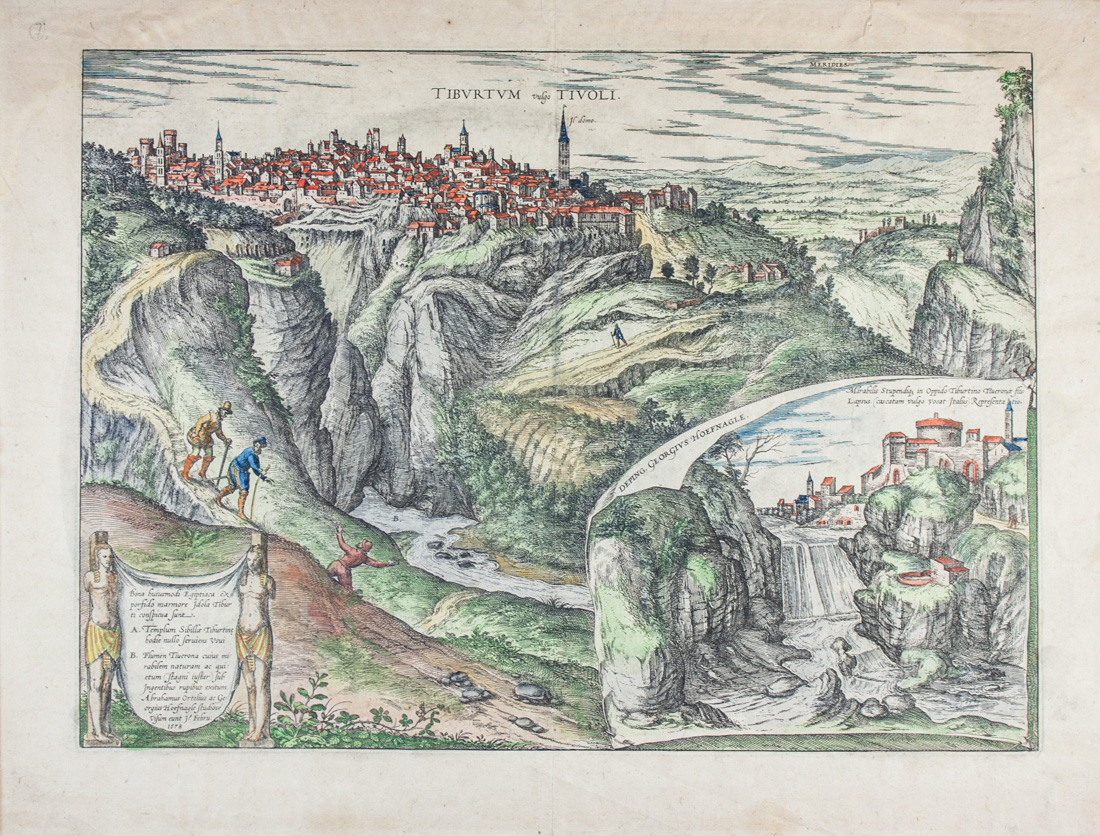 Incisione in rame in coloritura antica. mm 330x455. Foglio: mm 398x524. Titotolo in alto al centro. In basso a destra particolare della Cascata di Tivoli; in basso a sinistra legenda dei luoghi sorretta da due statue egizie. Testo al verso in francese. Da Civitates Orbis terrarum (Colonia, 1581).