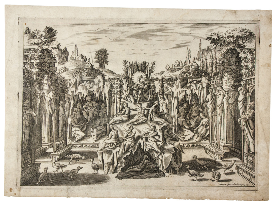 Bulino. mm 243x340. Foglio: mm 274x377. Il luogo teatrale a Firenze, 8.13.In lastra in basso a destra "D. Epif:° d'Alfiano. Mon:co Vallombrosano..f.1592." Il soggetto è tratto dal V Libro delle Metamorfosi di Ovidio e raffigura la Contesa tra Muse e Pieridi con quest'ultime, sconfitte, mutate in gazze e corrisponde al secondo intermezzo de La Pellegrina di Girolamo Bargagli, messa in scena a Firenze nel 1589 in occasione delle nozze tra Ferdinando de'Medici Granduca di Toscana e Cristina di Lorena. Bellissima impressione, nel I stato su 2 prima dell'indirizzo di Filippo Succhielli, su carta vergellata priva di filigrana.