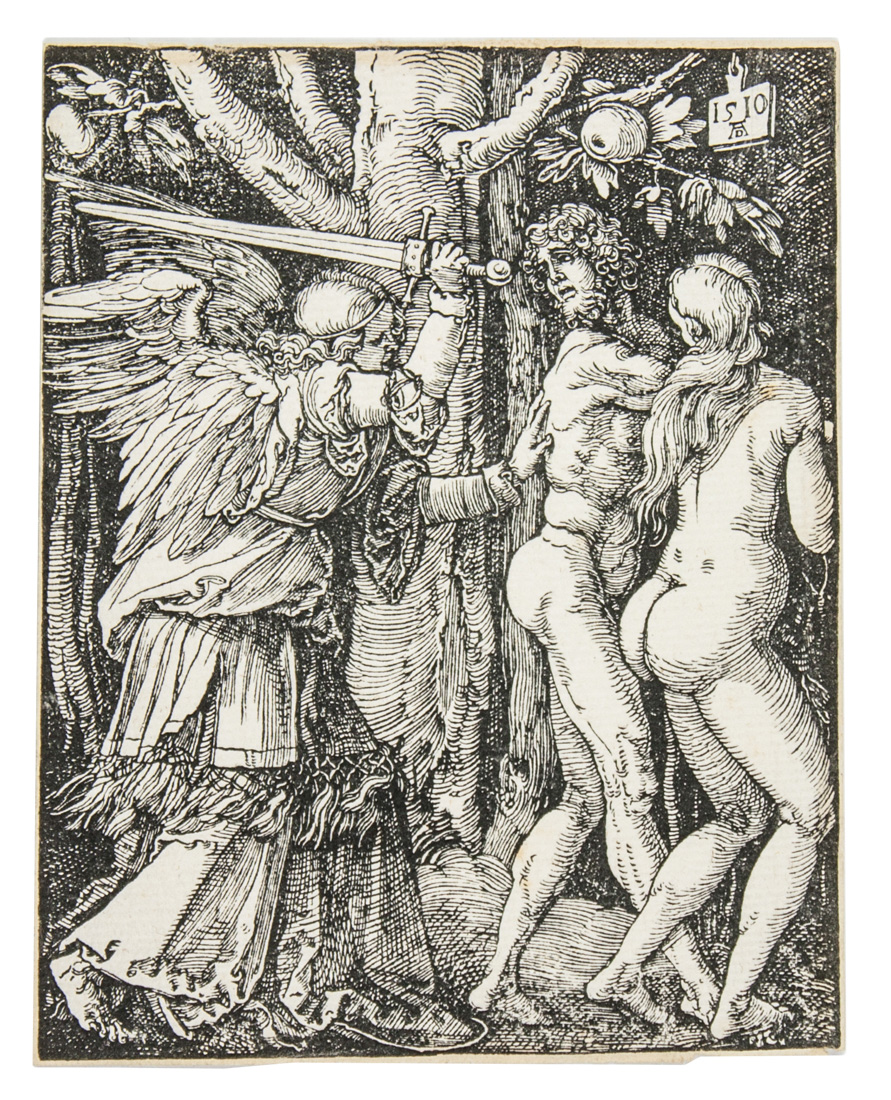 Xilografia. mm 124x100. Foglio: 128x101. Meder, 127. Strauss, Woodcuts, 138. Con il monogramma e la data "1510" in alto a destra. Da La piccola passione, serie di 37 tavole, delle quali solo quattro datate, due "1509" e due "1510", pubblicata per esteso in volume nel 1511 con versi latini di Benedetto Chelidonio. Ottima prova nel II stato su 2, con la spina dorsale di Eva accorciata, in edizione tarda priva del testo.