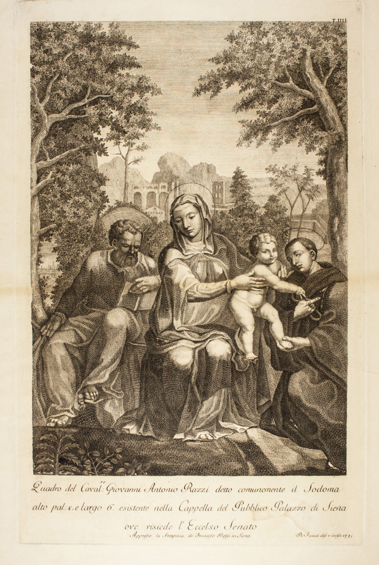 Bulino. mm 490x310. Foglio: mm 610x425. Firmata e datata nel margine bianco in basso a destra. Incisione tratta dalla Sacra Famiglia con san Leonardo dipinta attorno al 1530 da Giovanni Antonio Bazzi detto il Sodoma per la cappella dei Nove in Palazzo Pubblico a Siena. Bella prova su carta non vergata con filigrana lettere "M.A..." ed iscrizione.