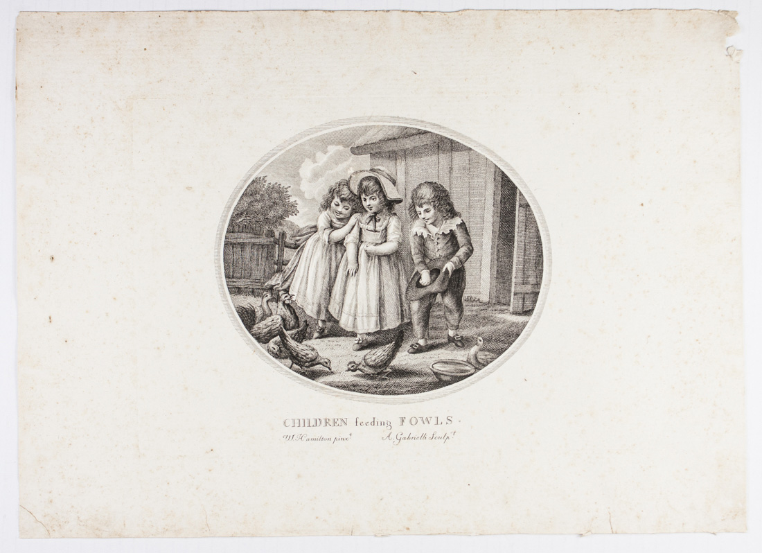 Bulino in ovale su lastra quadrata. mm 173/207x218/245. Foglio: mm 255/260x357/360. Le rafffigurazioni, ad opera di due artisti bassanesi, il Bonato allievo dell'altro artista bassanese Giovanni Volpato, sono tratte da invenzioni con giochi di bambini del pittore londinese William Hamilton (Chelsea/Londra 1751-1801). Ottime prove su carta vergellata pesante, (10)