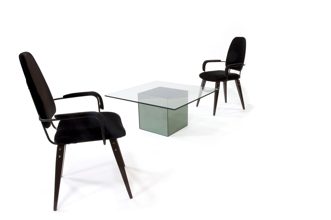POLTRONE Coppia di poltroncine con telaio in metallo laccato. gambe in rovere massiccio fissate con perni in ottone. Imbottitura (non originale) in velluto marrone. cm 97x56x56